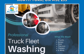 Truck Power Washing North York – All Season Enterprise Benefits of Regular Truck Power Washing Keeping your commercial fleet pristine isn’t merely cosmetic—it represents a strategic investment in your business’s reputation, asset longevity, and operational efficiency. When trucks traverse North York’s diverse roadways, they encounter an unforgiving environment of industrial debris, weather-related contaminants, and urban grime that steadily degrades vehicle conditions without proper maintenance. Professional truck washing delivers measurable returns through enhanced brand visibility. Your trucks serve as mobile billboards traveling hundreds of miles daily, generating thousands of impressions. A spotless fleet communicates competence and reliability, while dirty vehicles suggest negligence that can undermine customer confidence. Marketing research confirms that vehicle appearance significantly influences consumer perception, with clean fleets generating more positive brand associations and customer trust. Preventive maintenance represents another compelling benefit. Regular washing exposes potential problems early—fluid leaks become visible, rust formation can be addressed before spreading, and body damage gets documented promptly for insurance purposes. This proactive approach prevents minor issues from escalating into costly repairs that sideline vehicles and disrupt operations. Regulatory compliance adds another dimension to washing frequency considerations. Industries transporting perishables, pharmaceuticals, or hazardous materials face strict cleanliness requirements. Inspectors assess overall vehicle condition, and excessive dirt signals potential maintenance deficiencies that trigger more thorough examinations. Maintaining clean trucks reduces inspection complications and demonstrates commitment to regulatory standards. The financial protection aspect shouldn’t be overlooked. North York’s winter conditions introduce road salt and chemical de-icers that aggressively attack metal surfaces. Without regular removal, these corrosive agents compromise paint integrity, promote rust formation, and accelerate deterioration of undercarriage components. Consistent washing prevents this damage, preserving vehicle value and extending operational lifespan well beyond industry averages. Our Truck Power Washing Process Our Truck Power Washing North York methodology combines industry best practices with cutting-edge equipment to deliver superior results consistently. Every service begins with a detailed vehicle assessment where technicians identify problem areas requiring specialized attention—whether heavy grease accumulation around mechanical components, stubborn staining on trailer sides, or salt buildup in wheel wells and undercarriage areas. Pre-treatment application constitutes the foundation of effective cleaning. We deploy commercial-grade degreasers and surfactants engineered specifically for transportation equipment. These formulations penetrate and dissolve oil-based contaminants, road tar, and industrial residues that water pressure alone cannot remove. Application timing is critical—we allow sufficient dwell time for chemicals to work effectively without risking surface damage from over-exposure. High-pressure washing follows pre-treatment, using equipment calibrated to deliver between 1500-3000 PSI depending on surface requirements. Technicians adjust pressure dynamically based on what they’re cleaning—higher pressure for heavily soiled undercarriages and wheel assemblies, reduced pressure for painted surfaces, decals, and sensitive components. This nuanced approach maximizes cleaning effectiveness while protecting vehicle integrity. Attention to detail separates professional service from basic washing. We focus intensively on high-visibility areas including company branding, DOT numbers, and identification markings. These elements must remain legible for compliance purposes and brand representation. We also thoroughly clean mirrors, windows, lights, and reflectors—critical safety components that must function optimally in all conditions. Undercarriage cleaning represents a specialized component often overlooked in standard washing. We utilize dedicated equipment to access and clean chassis components, suspension systems, and fuel tank exteriors where corrosive materials accumulate. This service is particularly valuable during winter months when salt removal prevents expensive corrosion damage. The finishing process ensures professional presentation. We employ de-ionized water for final rinsing, which prevents mineral deposits and water spotting that compromise appearance. Final inspection verifies every surface meets quality standards before releasing the vehicle. This systematic approach guarantees consistency regardless of vehicle condition or service volume. Pricing for Truck Washes in North York Transparent pricing helps fleet managers make informed decisions about maintenance investments. Our Truck Power Washing North York rates reflect market competitiveness while ensuring service quality never compromises profit margins. We structure pricing to accommodate diverse fleet requirements, from owner-operators with single trucks to major carriers managing extensive operations. Individual wash pricing varies based on vehicle configuration and cleaning requirements. Full tractor-trailer combinations typically range from $80 to $160 per wash, factoring in overall size, contamination level, and any specialized requirements. Straight trucks, box trucks, and smaller commercial vehicles generally cost between $55 and $90. These prices encompass complete exterior cleaning including all vertical surfaces, wheels, and basic undercarriage access points. Contract pricing delivers substantial value for regular customers. Businesses committing to consistent service schedules receive discounted rates that improve significantly with volume. Five-truck monthly contracts ty